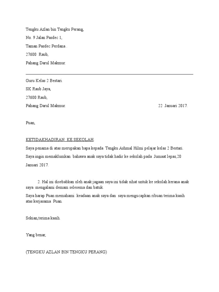 Surat Rasmi Tidak Hadir Ke Sekolah Pdf